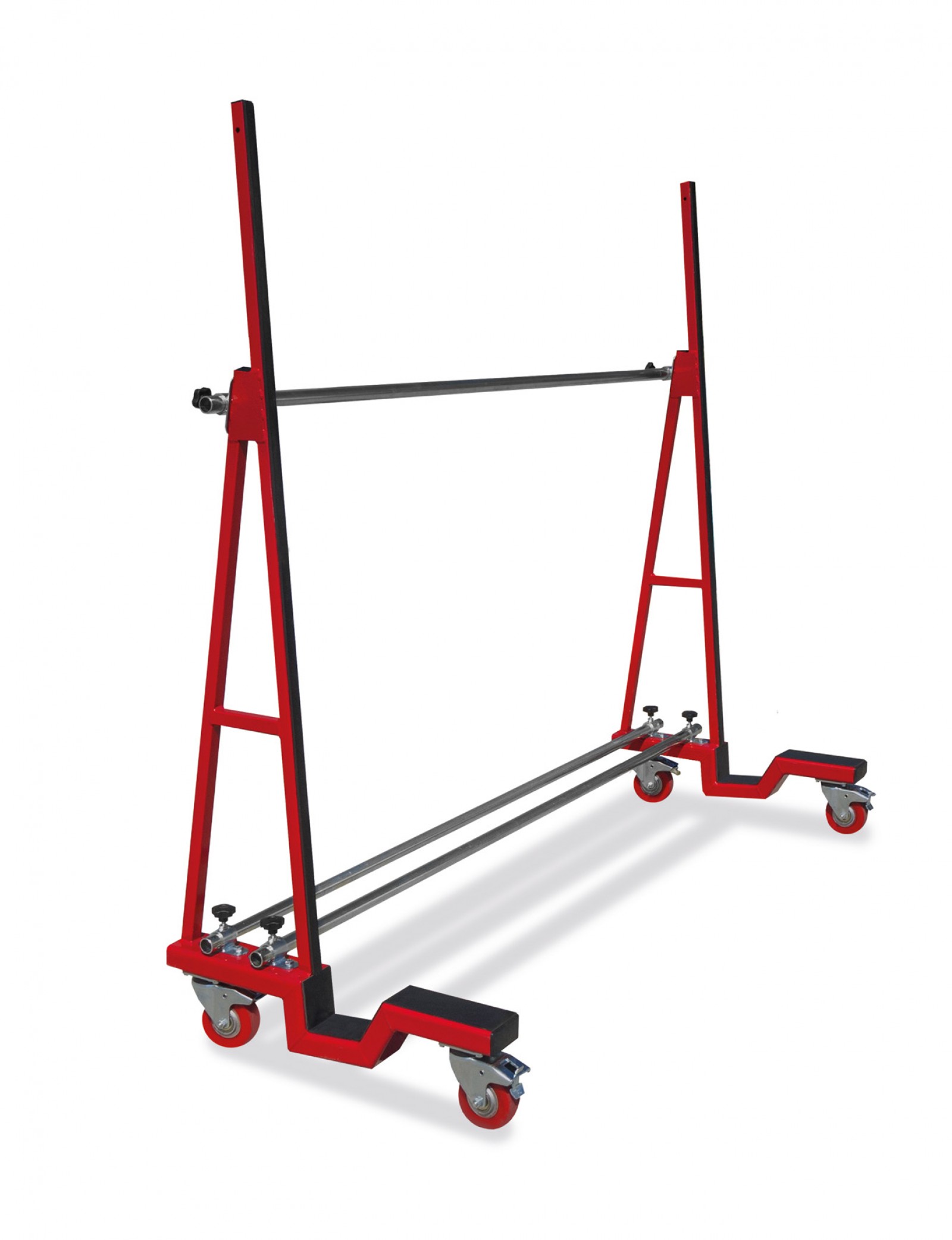 The powder-coated UPT 800 glass trolley can be used for materials of any kind up to a load capacity of 800 kg. It can easily and safely transport elements up to 6 x 3.5 m with a thickness up to 120 mm. Its solid rubber tyres are especially suited for indoor work. Also, each wheel of the trolley can be chosen separately. It can be taken apart in just a few steps without tools, fitting into any transporter or utility wagon.
